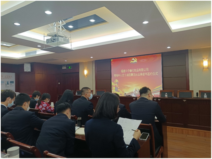 会上,营销中心全体员工还与化妆品公司签订了《福建片仔癀化妆品有限公司营销中心员工诚信廉洁从业承诺书》。