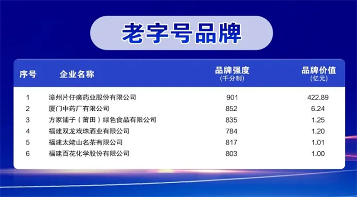 以品牌强度901、品牌价值422.89亿元位居福建省“中华老字号品牌”第1位