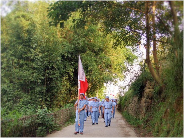 从纪念馆出来,学员们换上了红军服装,手举福建省第一支红色革命武装福建工农革命军独立第一团的军旗,走着整齐的步伐来到90年前这支部队曾经操练的古榕树下,进行平和暴动攻城誓师大会现场模拟教学,真实再现当时大战来临的场景,寻觅当年那炮火纷飞的印记。遒劲有力,树冠如盖的撑天古榕见证着历史的烟消云散,不变的是中国共产党不变的初心。