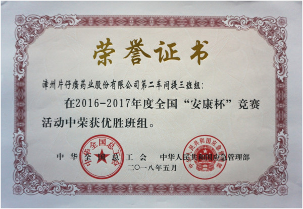 近日,全国总工会和国家应急管理部联合下发文件,表彰20162017年度全国“安康杯”竞赛优胜集体、优胜班组和优秀个人。片仔癀药业公司第二车间提三班组(现为饮片车间提三班组)被授予20162017年度全国“安康杯”竞赛优胜班组荣誉称号。参与此次“安康杯”竞赛活动的企业达62万家,参赛职工达1.2亿人,共评出795家优胜集体、779个优胜班组和245名优秀个人。
