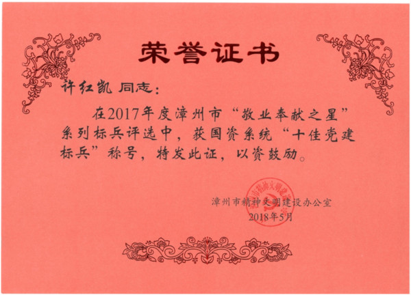 2017年漳州市文明办开展“敬业奉献之星”系列标兵评选活动。此次活动以培育和弘扬“工匠精神”,围绕“服务大发展,建设新福建”的主题。
