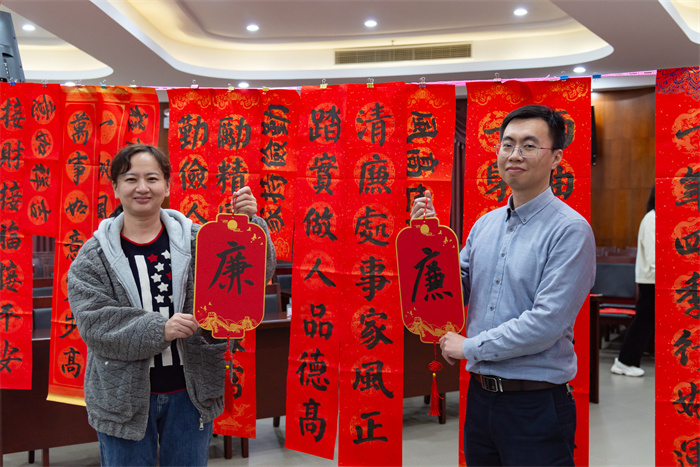 翰墨飘香传清风 迎年纳福送春‘廉’。活动现场,书法家们挽袖执笔,挥毫泼墨,用一行行俊秀苍劲的书法把廉洁文化、家风家训写入春联之中,一副副立意新颖、寓意丰富的廉政文化春联寄托了对新年的憧憬,也弘扬了风清气正、廉洁奉公的理念,给全体职工带来了浓浓的廉洁文化气息。