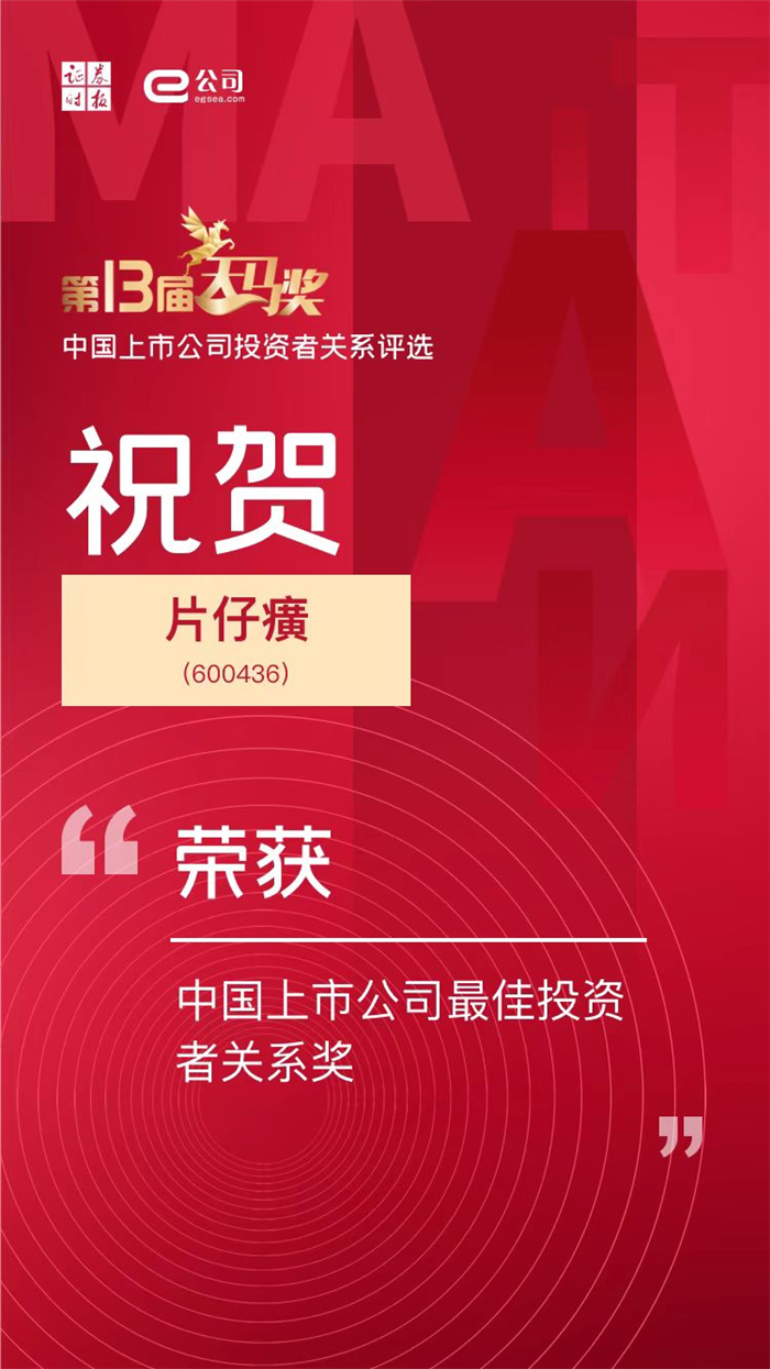 近日,由证券时报社主办、e公司承办的第十三届中国上市公司投资者关系天马奖专家评审委员会研讨会如期举行。同时,第十三届中国上市公司投资者关系天马奖榜单正式揭晓。漳州片仔癀药业股份有限公司荣获第十三届天马奖“最佳董事会奖(2021年度)”和“最佳投资者关系奖(2021年度)”。