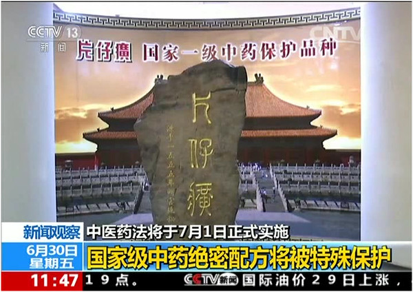 6月30日,央视新闻频道《新闻直播间》栏目围绕《中医药法》正式施行,就国家级中药绝密配方将获特殊保护对片仔癀进行报道。