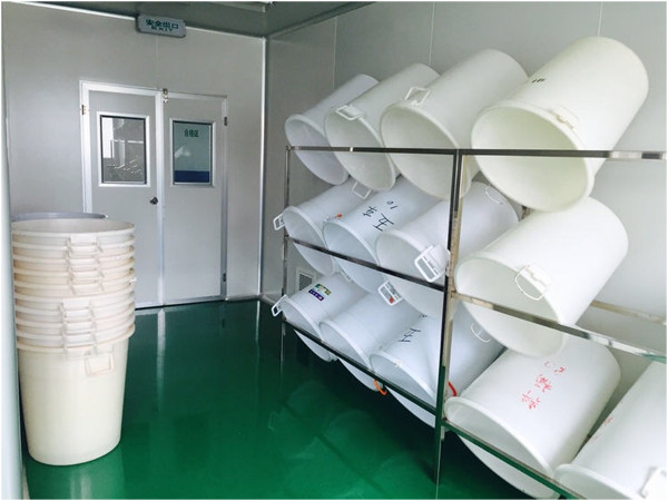 ▲第五车间:物料桶清洗干净、摆放整齐