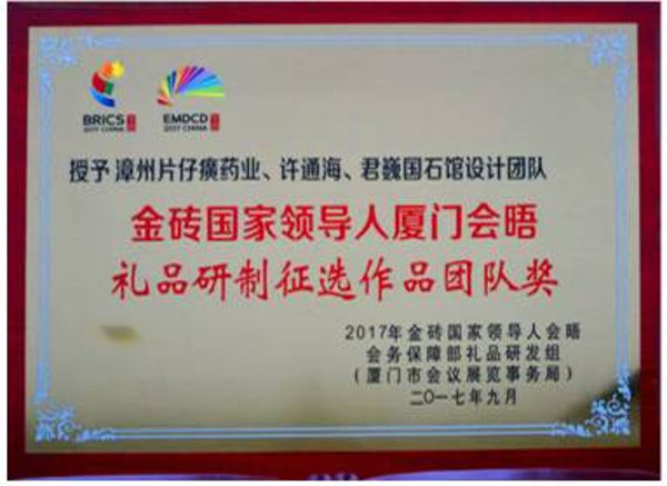 漳州片仔癀药业、许通海、君巍国石馆合作研制的《福建三宝》礼盒荣获厦门金砖国家领导人会晤国礼征选作品团队奖。片仔癀继1972年中日建交被当作“国礼”后,多次走出国门,向世界各国人民展示了中医药文化及“福建三宝”的独特魅力。