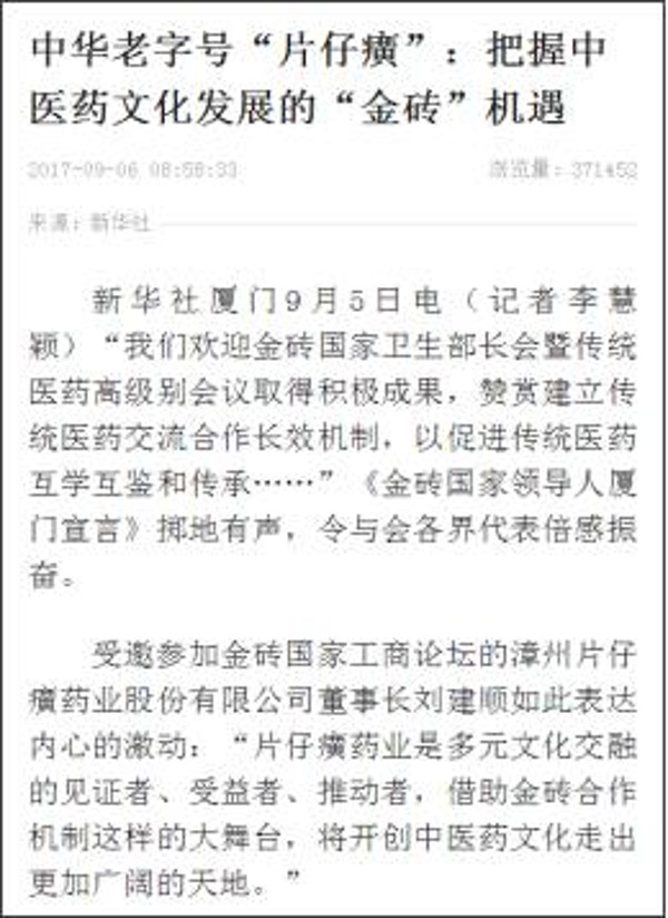 3. 工商论坛期间,片仔癀药业董事长刘建顺接受新华社、中国证券报等多家媒体专访,片仔癀药业的声音和观点备受金砖国家工商业界和国内权威媒体的关注,新华社发布的新闻通稿浏览量达37.2万次。
