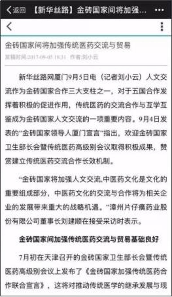 新华社:《中华老字号“片仔癀”:把握中医药文化发展的“金砖”机遇》
