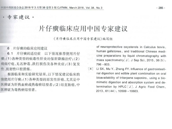 由中国医师协会中西医结合医师分会组织编写的《片仔癀临床应用中国专家建议》总结了片仔癀已发表的药理毒理、临床、质量标准研究文献资料,形成《片仔癀临床应用中国专家建议》,于2018年3月份发表于中国中西医结合杂志2018年第3期。