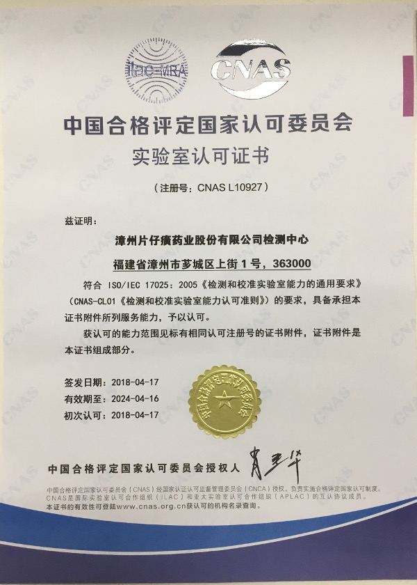 2018年4月17日,漳州片仔癀药业股份有限公司检测中心成功获得由中国合格评定国家认可委员会(CNAS)颁发的实验室认可证书,正式通过国家实验室认可。