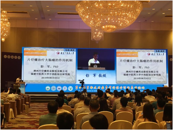 本次论坛以“胃肠道肿瘤多学科综合治疗”为主题,以“规范化、精准化”为宗旨,着眼于国际前沿领域研究,探讨学术争议热点。近900位胃肠道肿瘤领域的专家学者齐聚一堂、共襄盛举,体现了学术交流的继承性、创新性、开放性,为业界搭建一个共同学习和交流的平台。在胃肠道肿瘤峰会专题卫星会上,由权威专家中西医结合研究院副院长、福建中医药大学医学实验中心主任彭军教授发表了主题为《片仔癀抗大肠癌作用探索研究》的专题演讲,彭军教授从片仔癀抑制肿瘤的增殖、抑制肿瘤血管新生、逆转肿瘤多药耐药性等方面详细阐述了片仔癀多靶点、多机制的抗大肠癌作用,该讲座得到了业内专家学者的赞誉和高度评价。