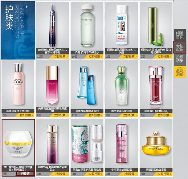 2. 在【护肤品类】页面处,点击雪融霜下角的“立即投票”,变成“已投票”后即投票成功。