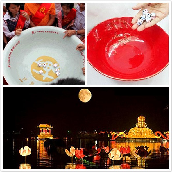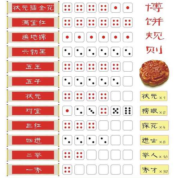 逆时针依次,每个人每次要把6个骰子一起投进大碗里(一定是要用瓷碗骰子才能跳的起来,增添获奖悬念和气氛),众人依次投骰子,看骰子的点数得饼。如果骰子掉出大碗,本轮就作废,到下轮继续参与。