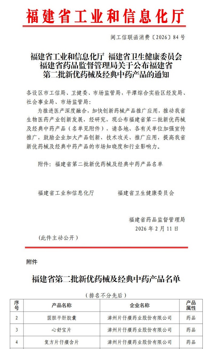 近日,福建省工业和信息化厅、卫生健康委员会、药品监督管理局联合公布第二批新优药械产品名单。片仔癀药业的茵胆平肝胶囊、心舒宝片、复方片仔癀含片三个独家品种入选。此前,公司核心产品片仔癀已入选首批名单。