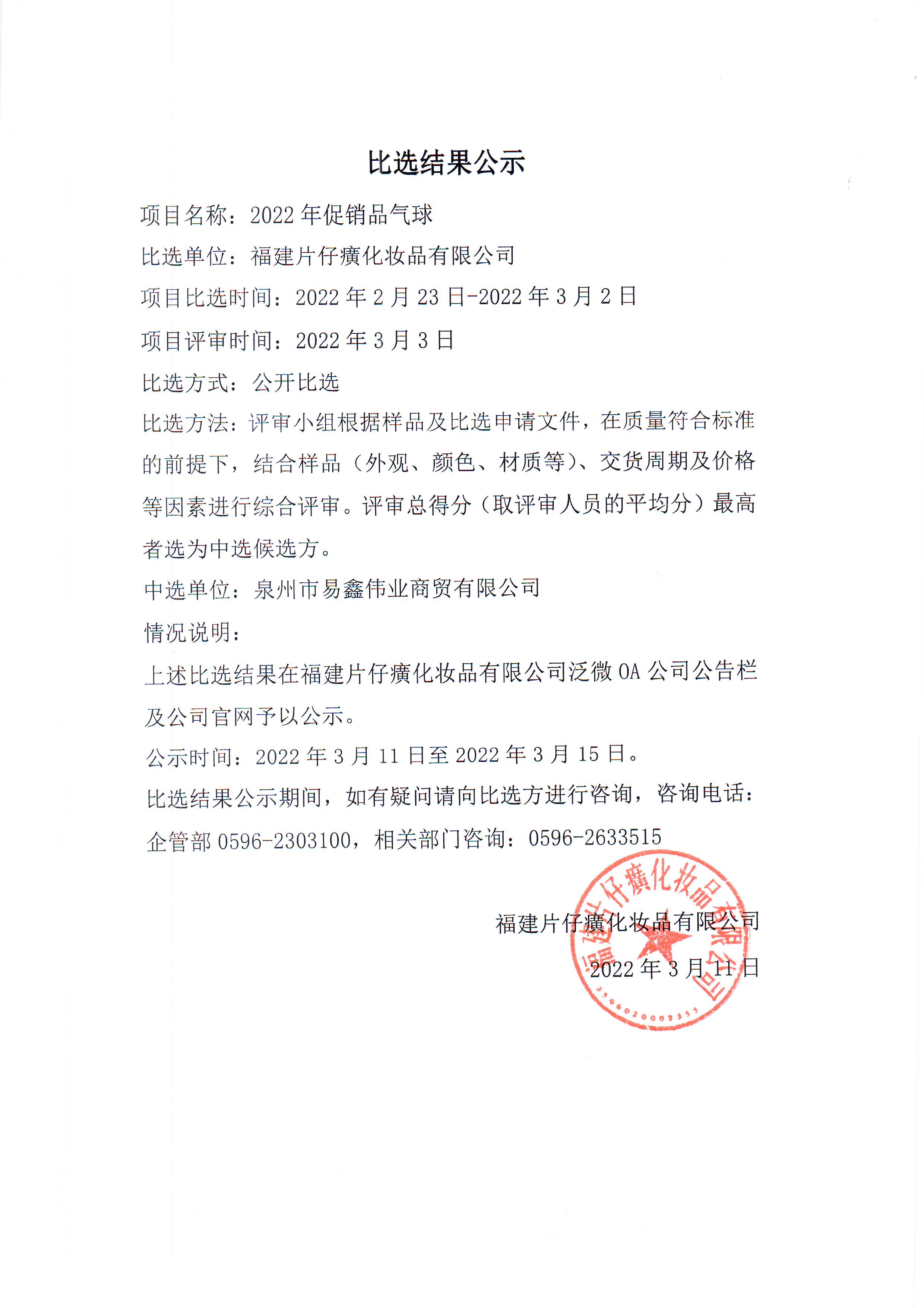 福建片仔癀化妆品有限公司2022年促销品气球比选结果公示