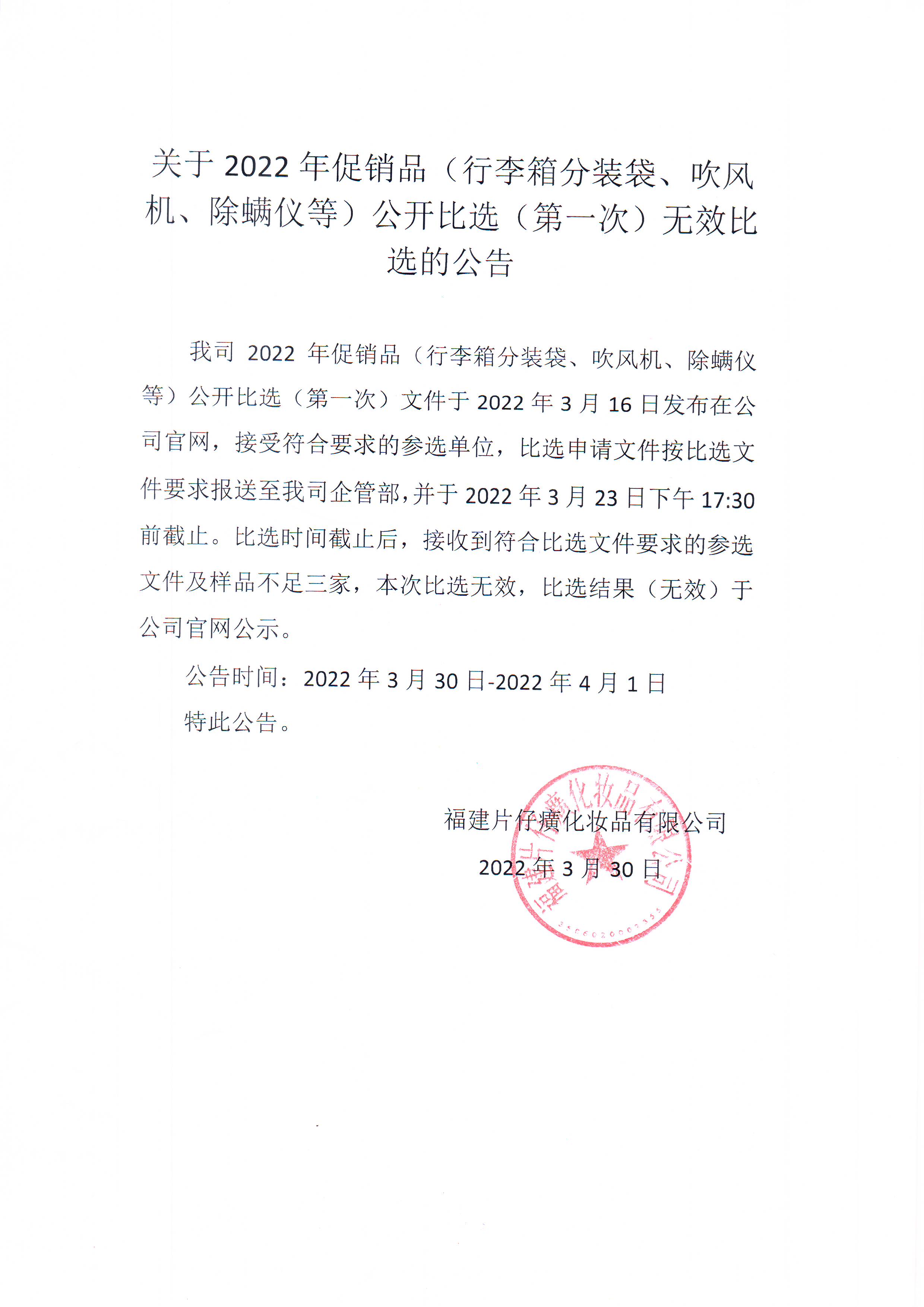 福建片仔癀化妆品有限公司关于2022年促销品公开比选(第一次)无效比选公告