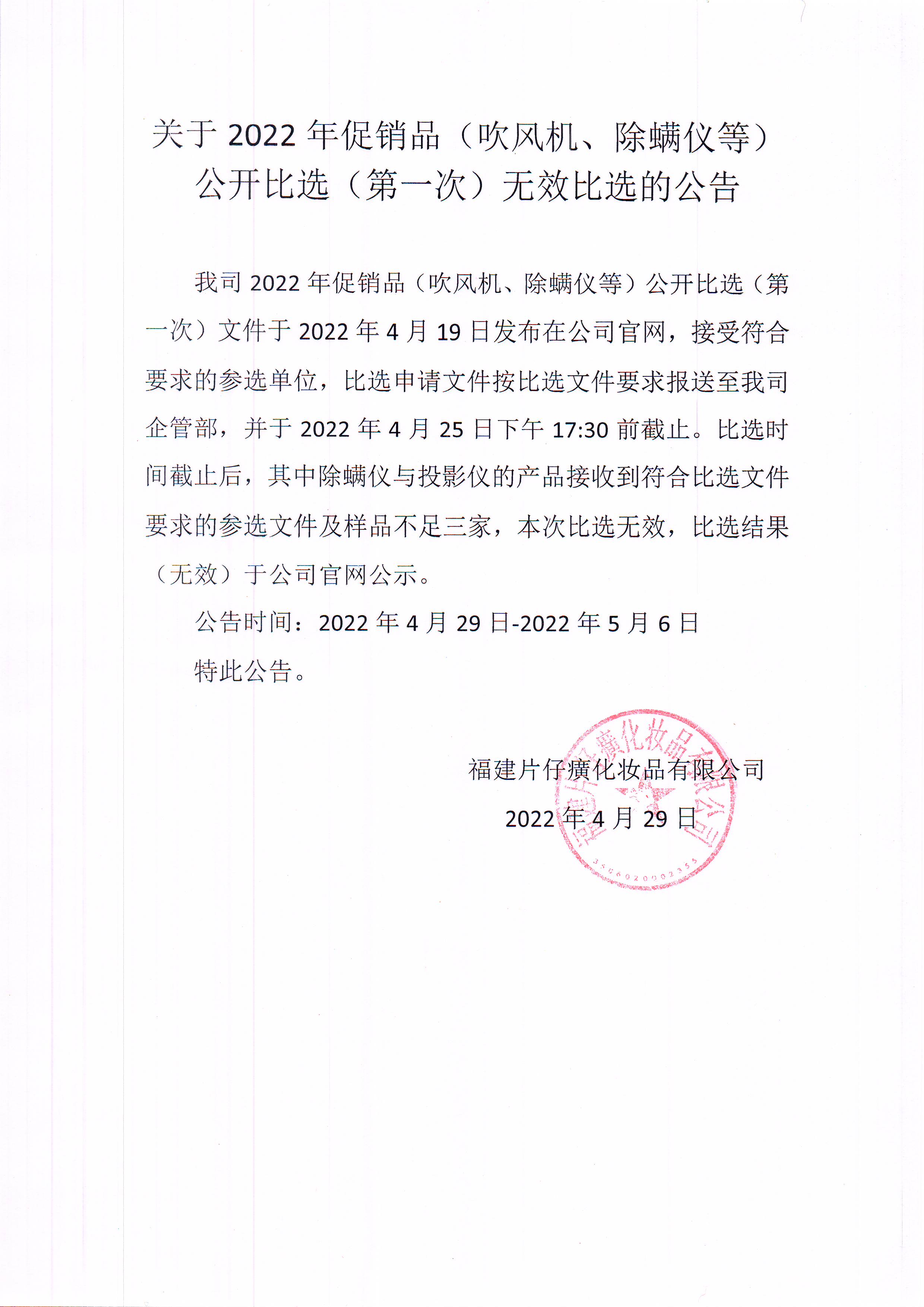 福建片仔癀化妆品有限公司关于2022年促销品(吹风机、除螨仪等)公开比选(第一次)无效比选的公告