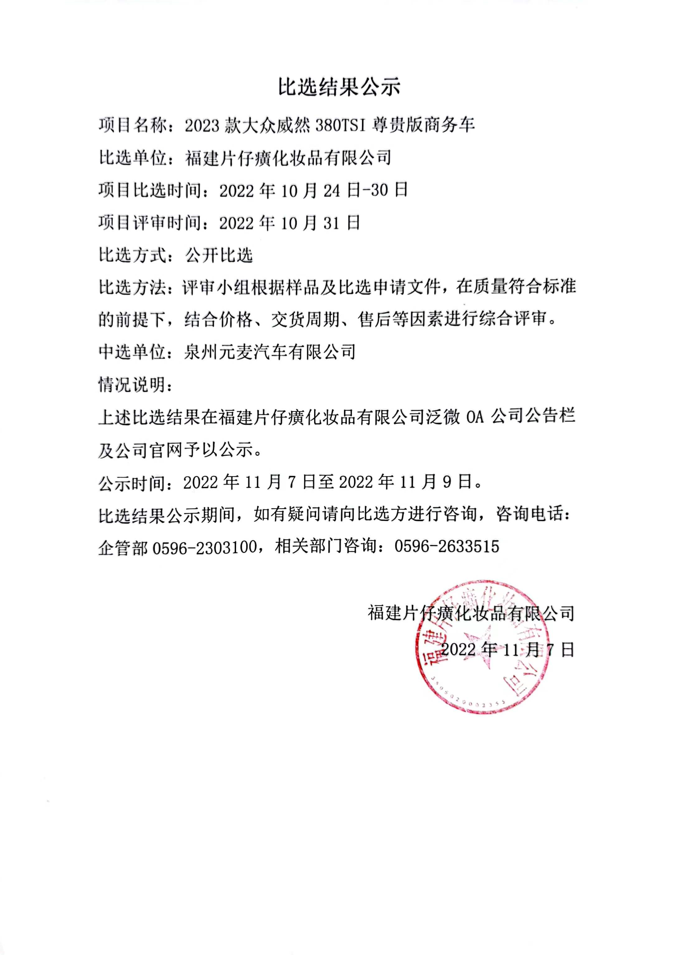 2023款大众威然380TSI尊贵版商务车比选结果公示