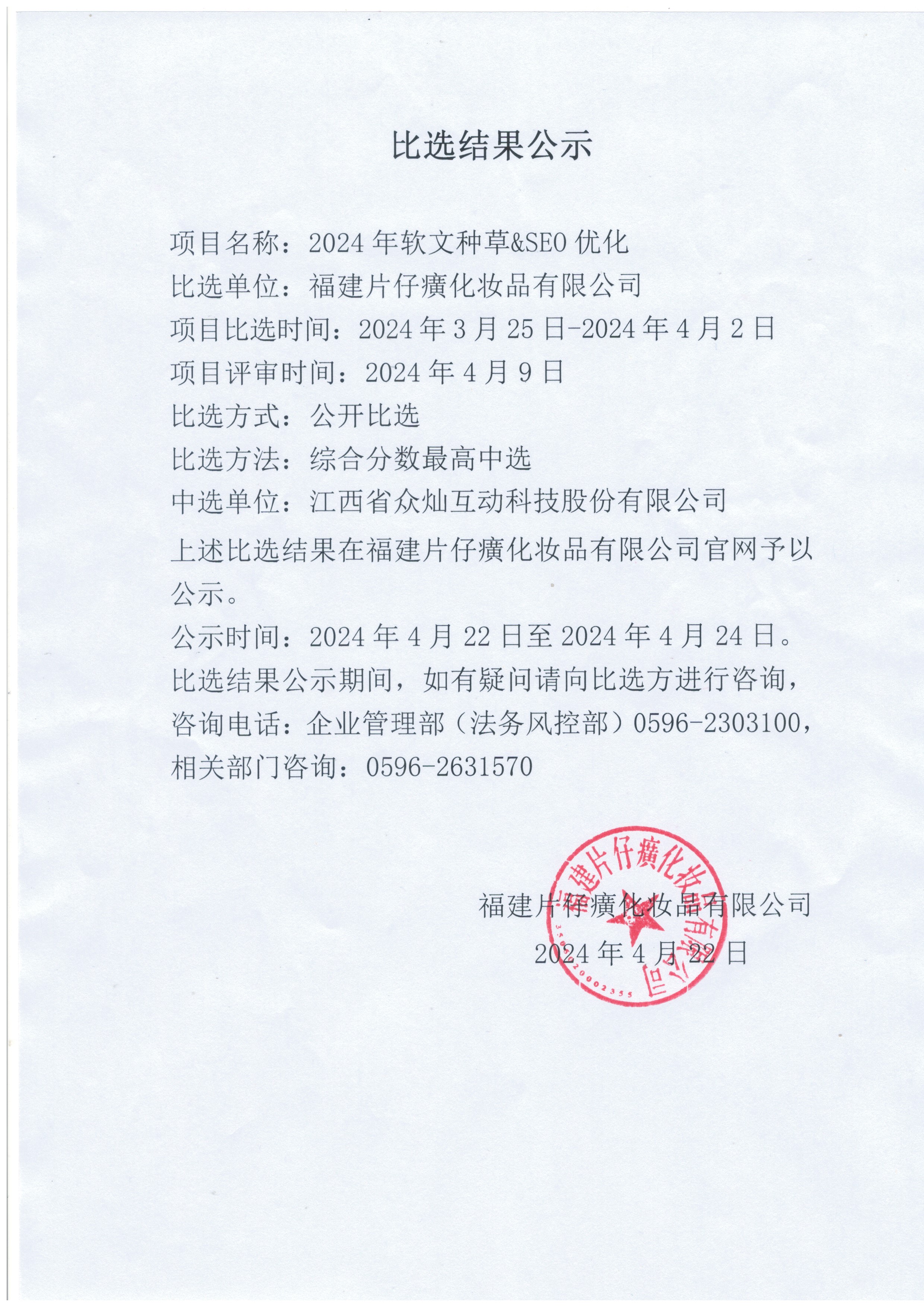 福建片仔癀化妆品有限公司2024年软文种草&SEO优化项目比选结果公示