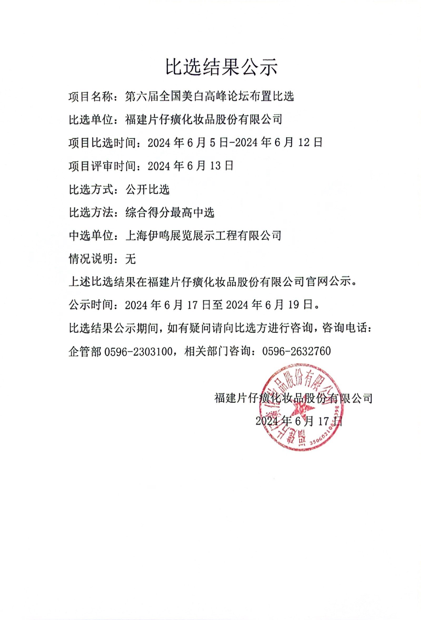 福建片仔癀化妆品股份有限公司第六届全国美白高峰论坛布置比选结果公示
