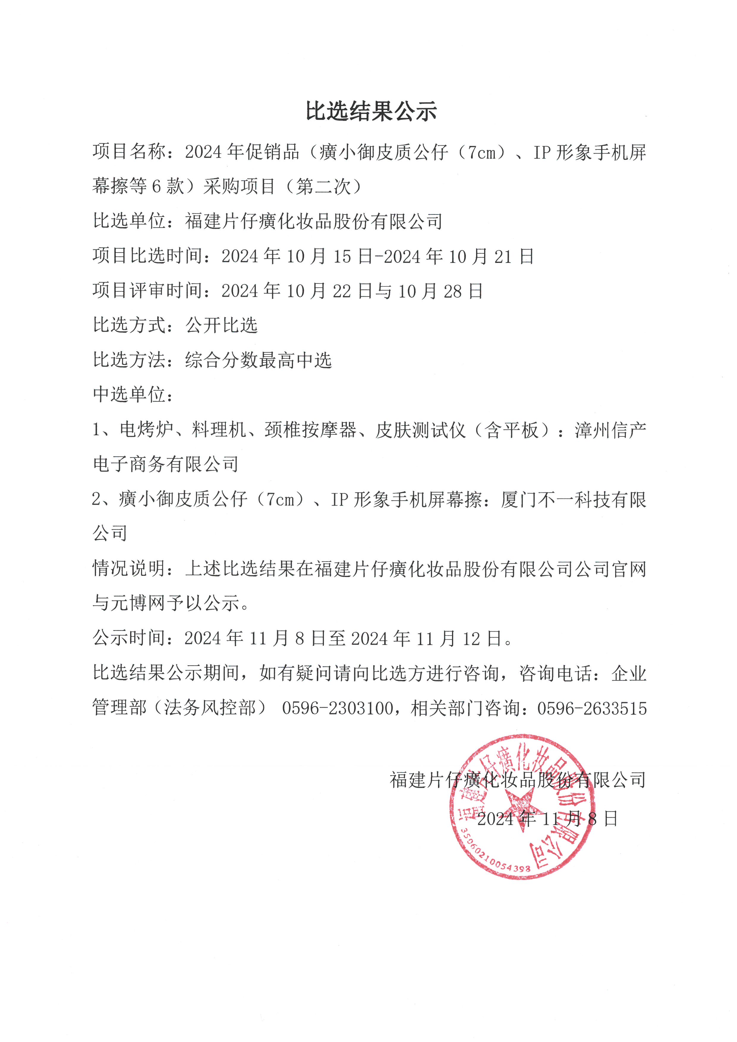 福建片仔癀化妆品股份有限公司2024年促销品(癀小御皮质公仔(7cm)、IP形象手机屏幕擦等6款)采购项目(第二次)比选结果公示