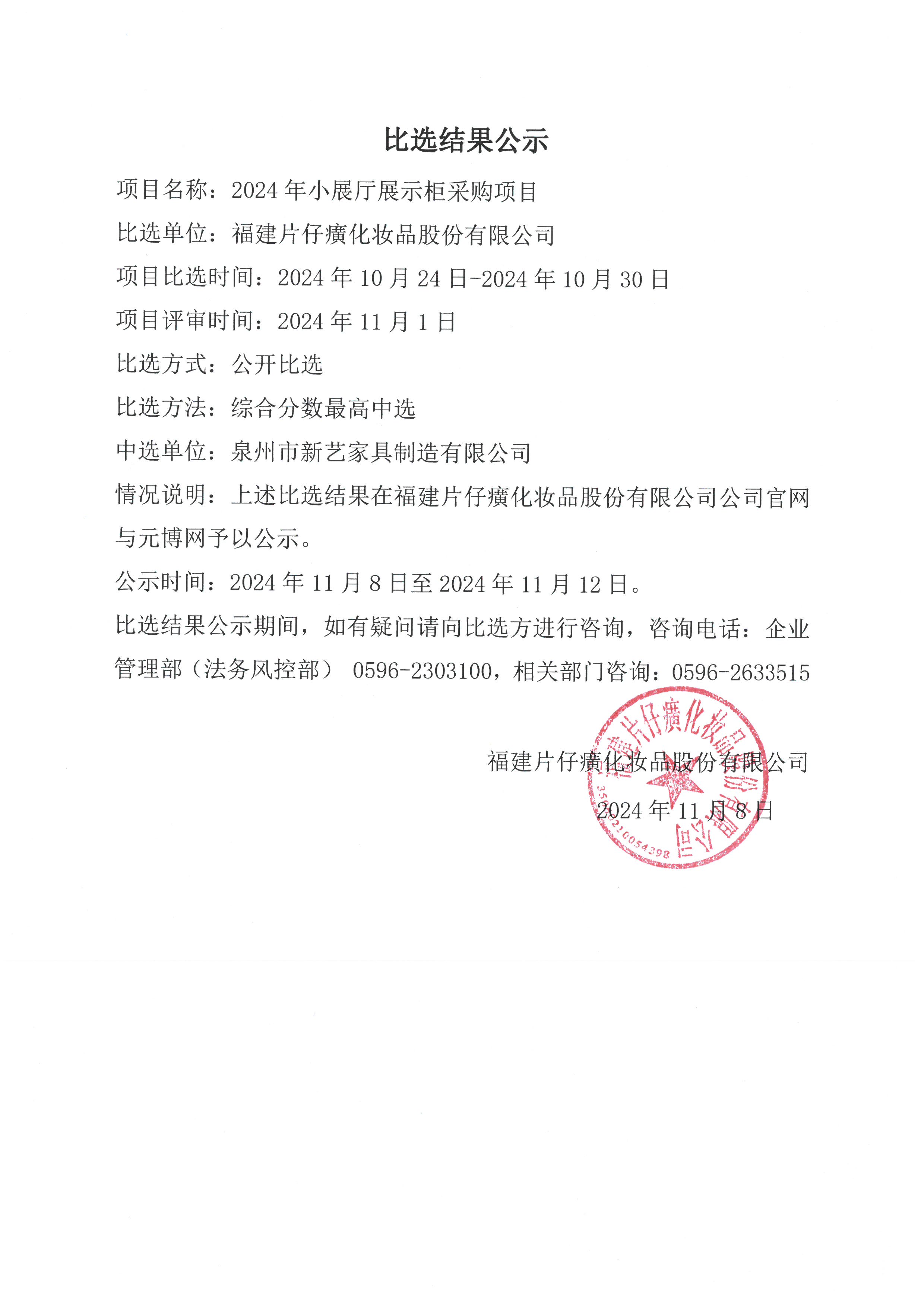 福建片仔癀化妆品股份有限公司2024年小展厅展示柜采购项目比选结果公示
