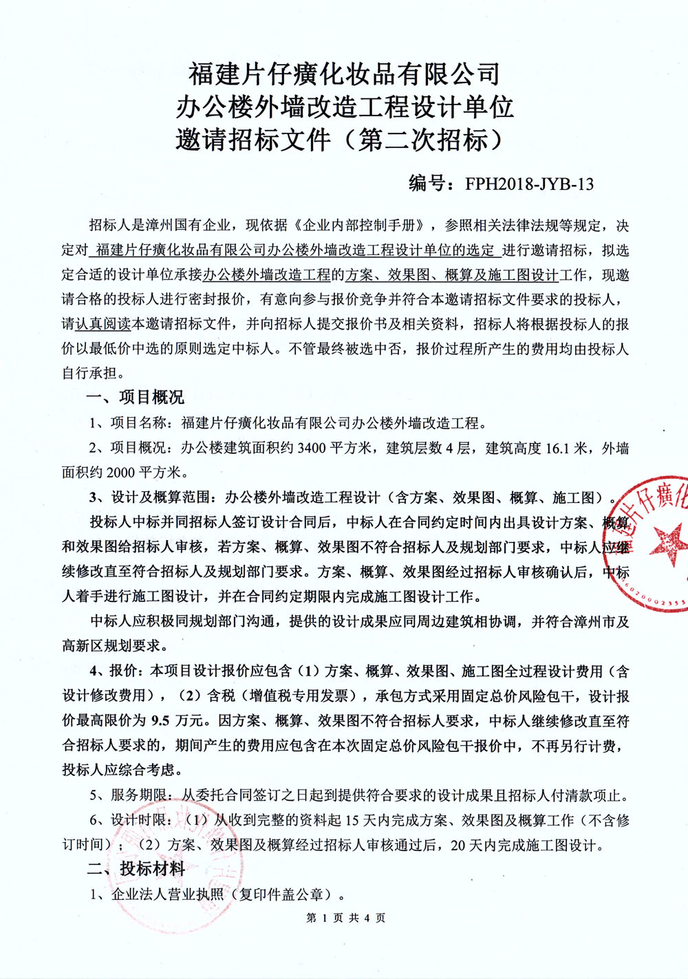 福建片仔癀化妆品有限公司办公楼外墙改造工程设计单位邀请招标文件(第二次招标)
