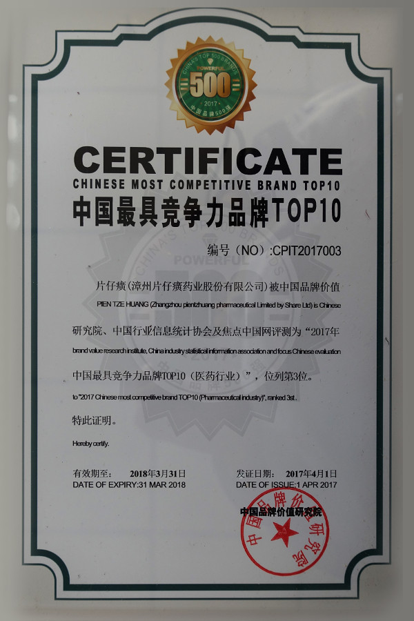 中国最具竞争力品牌TOP10证书(2017)