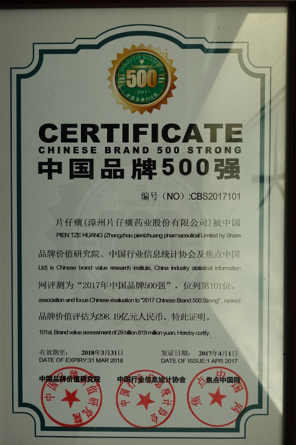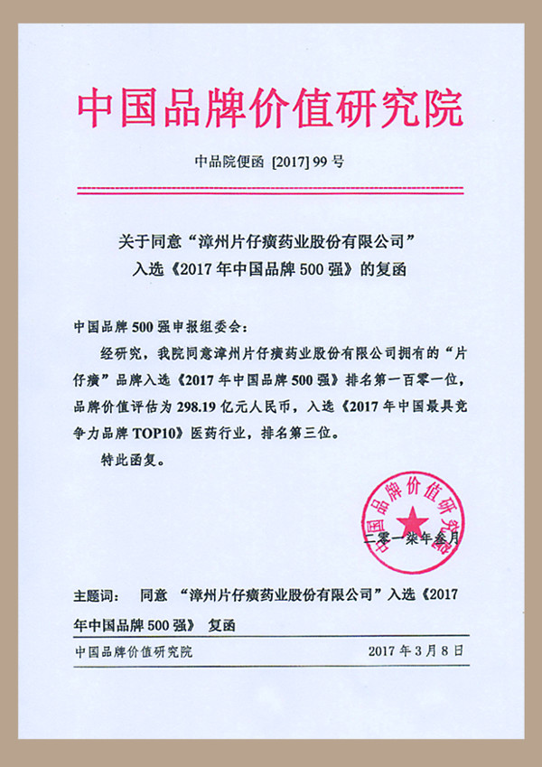 中国品牌500强证书(2017)