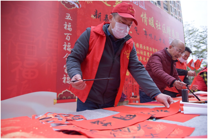 写春联、贴福字、贴窗花是中华民族欢度春节的传统习俗,象征着吉祥如意,更表达了人们对来年事事顺遂的美好愿景。为进一步弘扬中华优秀传统文化,营造欢乐祥和的节日氛围,弘扬向上向善的道德风尚,2022年1月18日上午,片仔癀公司党委以近邻党建为引领,携手九湖镇南山社区党支部在南星小区举办“墨香四溢迎新春 情暖社区赠春联”活动,邀请公司职工、职工子女及社区书法爱好者现场写春联,为即将到来的2022年春节增添年味。