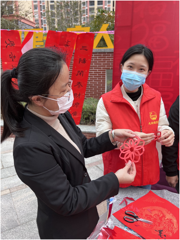 另一边,剪纸爱好者一边向大家介绍剪窗花的步骤和方法,一边折叠剪裁,一件件精美的窗花转眼就在灵巧的手中完成。社区居民们创作出一幅幅精美的窗花,互相给邻里带来虎年的喜庆,也提前为彼此送上新春祝福。