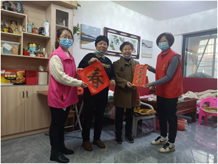 巾帼志愿者和新时代文明实践站志愿者一同为小区内行动不便的老人也送上新春的祝福。