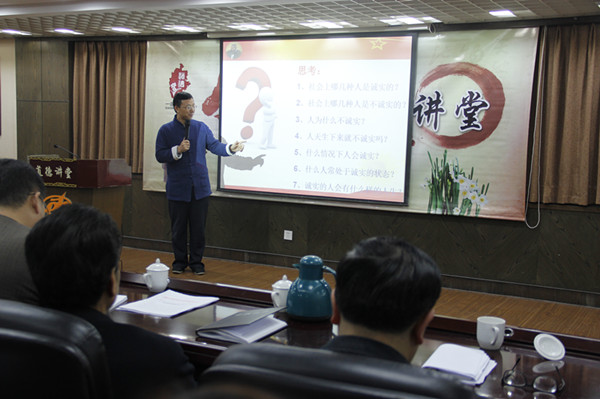 为弘扬中华民族的传统美德,倡导诚信经营的社会新风尚,3月11日下午,漳州市区道德讲堂示范课在片仔癀大厦二十四楼会议室开讲。道德讲堂以《德润人生——诚信经营·共筑幸福》为主题,设置了唱一首歌、看一个短片、听一个讲座、静默省心、向德鞠躬等十个环节。