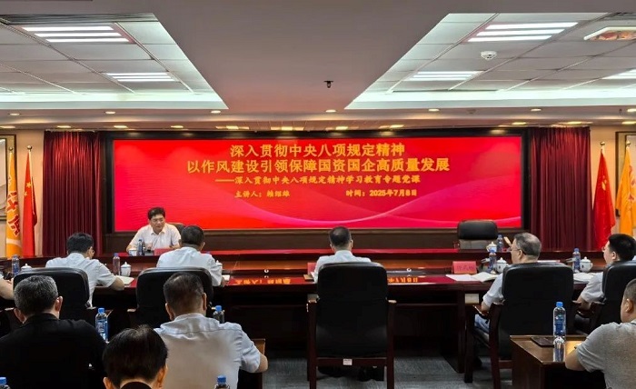 7月8日上午,漳州市国资委党委书记、主任赖绍雄以“深入贯彻中央八项规定精神 以作风建设引领保障国资国企高质量发展”为主题,为片仔癀药业股份有限公司党员干部讲授专题党课。片仔癀公司党委书记、董事长林志辉主持会议。