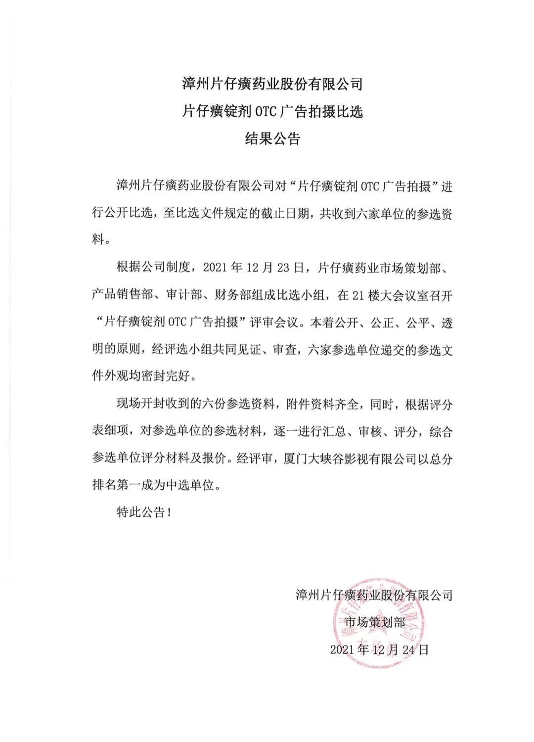 漳州片仔癀药业股份有限公司片仔癀锭剂OTC广告拍摄比选结果公告